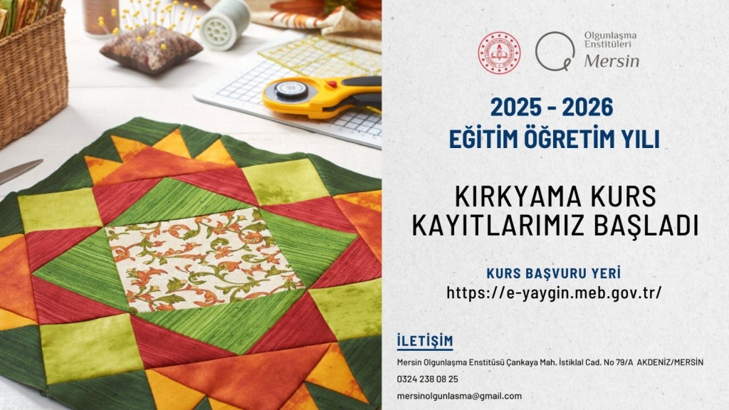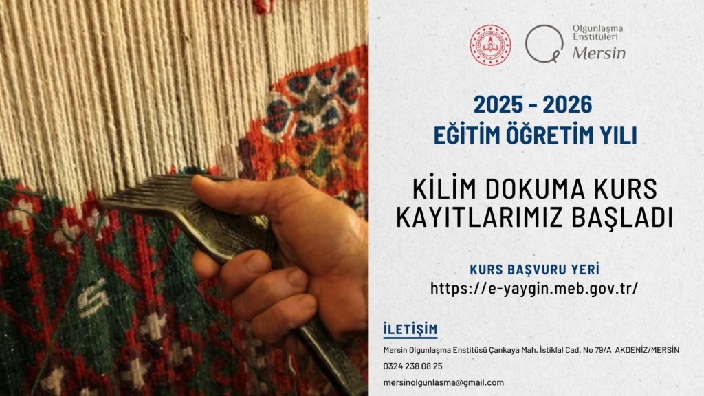 Mersin Olgunlaşma Enstitüsü’nde kurs başvuruları başlamıştır. Bu dönem Kırkyama, Kilim Dokuma, Serbest Seramik Şekillendirme, Boyacı-Çini İşlemeciliği ve Geleneksel Hamur Ürünleri Yapımı kursları açılacaktır. Eğitimler, farklı alanlarda kendini geliştirmek isteyen katılımcılara yönelik olarak planlanmıştır. Başvurularınızı bekliyoruz.